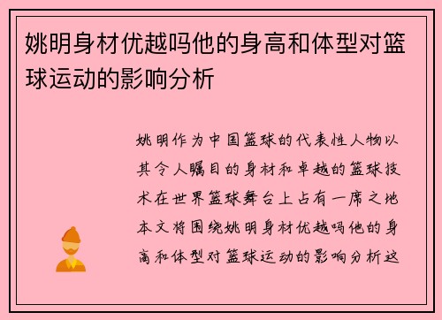 姚明,这位中国篮球的传奇巨星,以其卓越的身高、精湛的球技和强大的气场,深深吸引了全球球迷的目光。本文将从姚明在比赛中的经典瞬间出发,展示他作为篮球巨星的风采与魅力。这些经典瞬间不仅代表了他的个人成就,也象征着中国篮球在世界舞台上的崛起。文章将从四个方面进行详细阐述:姚明的职业生涯亮点、经典比赛回顾、对篮球文化的影响以及其退役后的贡献。通过这些角度,我们能够更全面地理解姚明这位伟大运动员所带来的震撼...