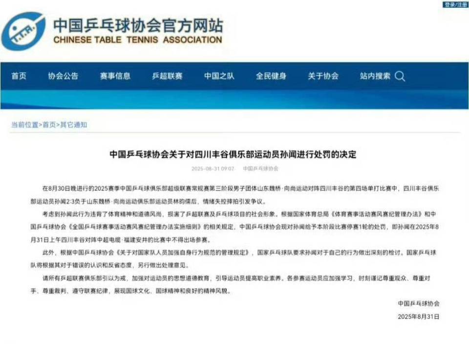 随后在8月31日,中国乒乓球协会迅速发布处罚决定,根据国家体育总局《体育赛事活动赛风赛纪管理办法》和中国乒乓球协会《全国乒乓球赛事活动赛风赛纪管理办法实施细则》,孙闻因违背体育精神和道德风尚,损害乒超联赛及乒乓球项目社会形象,被给予本阶段比赛停赛1轮的处罚,即缺席8月31日上午四川丰谷对阵中超电缆·福建安井的比赛。同时,国家乒乓球队要求孙闻作出深刻检讨,并将根据其反省态度另行处理。